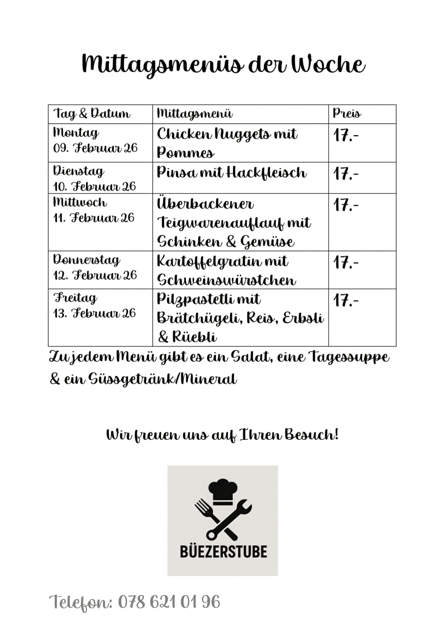 Unser Mittagsmenü kostet 17.– CHF und beinhaltet: